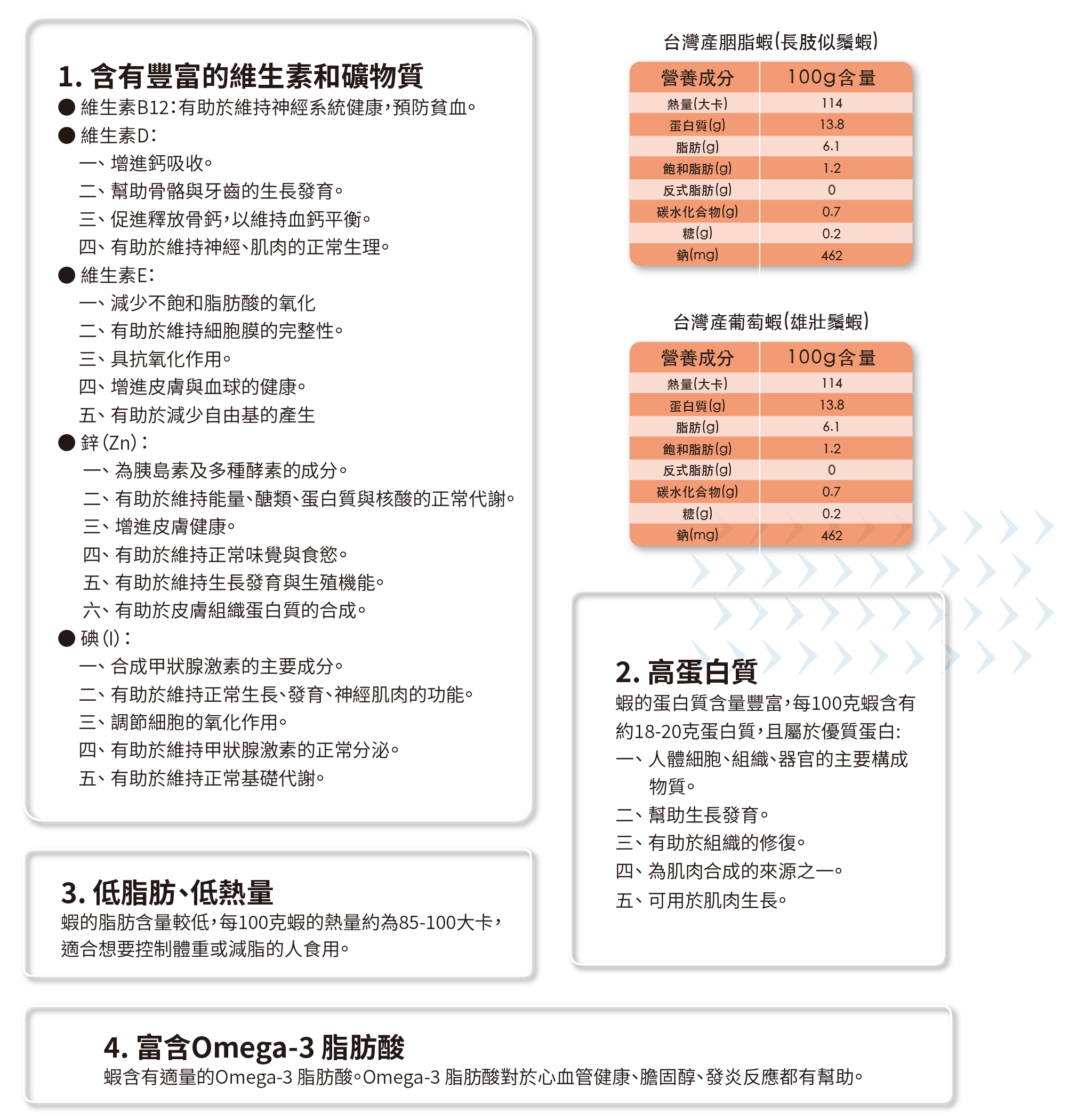 含有多種對人體有益的營養素,以下是蝦的主要營養價值: